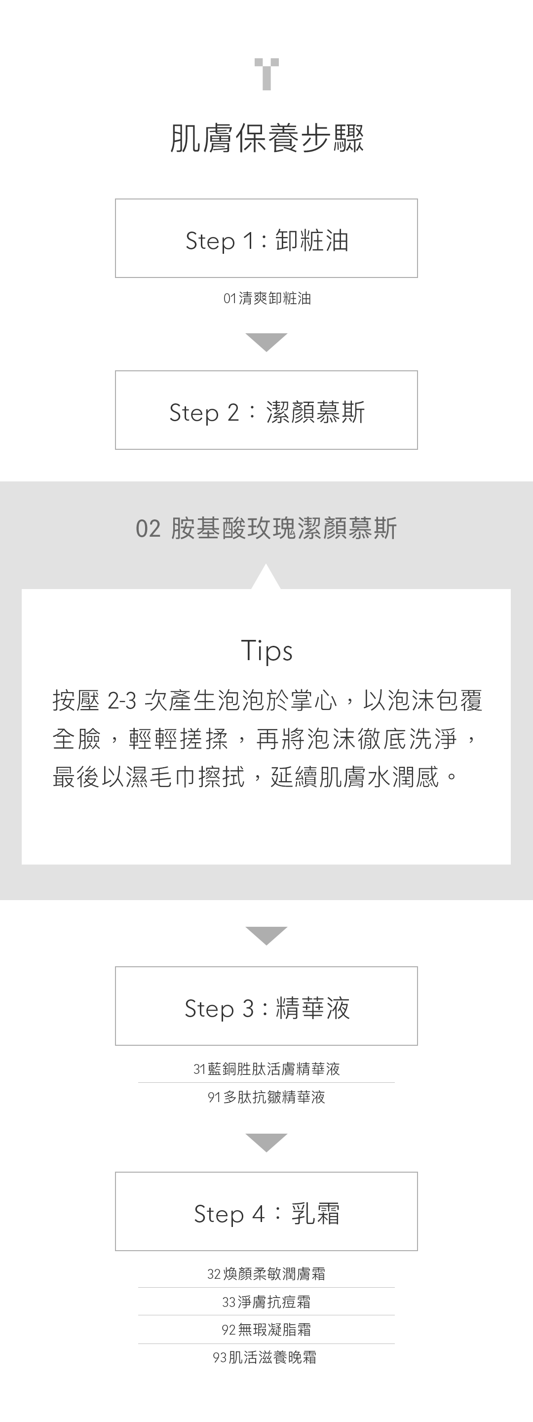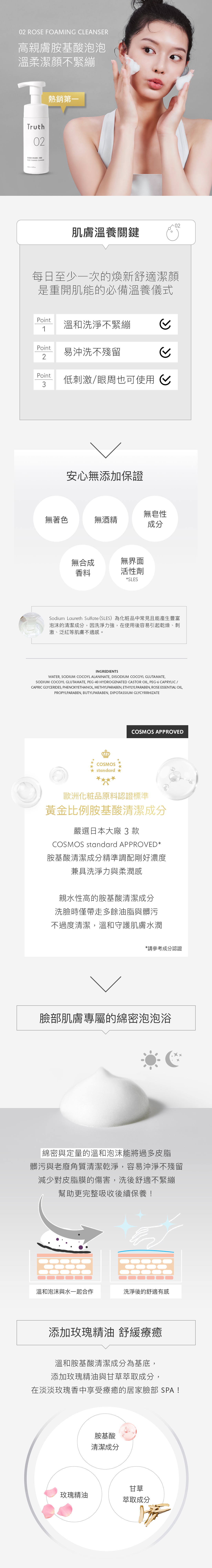 以研究胺基酸聞名於世並開發出多種供化粧品原料的日本大廠 — 味之素(Ajinomoto) 生產的胺基酸系清潔成分為主體,設計成洗淨力剛好的溫和慕斯。另外,以玫瑰花精油賦予慕斯香氣,增加使用時的愉悅氛圍。