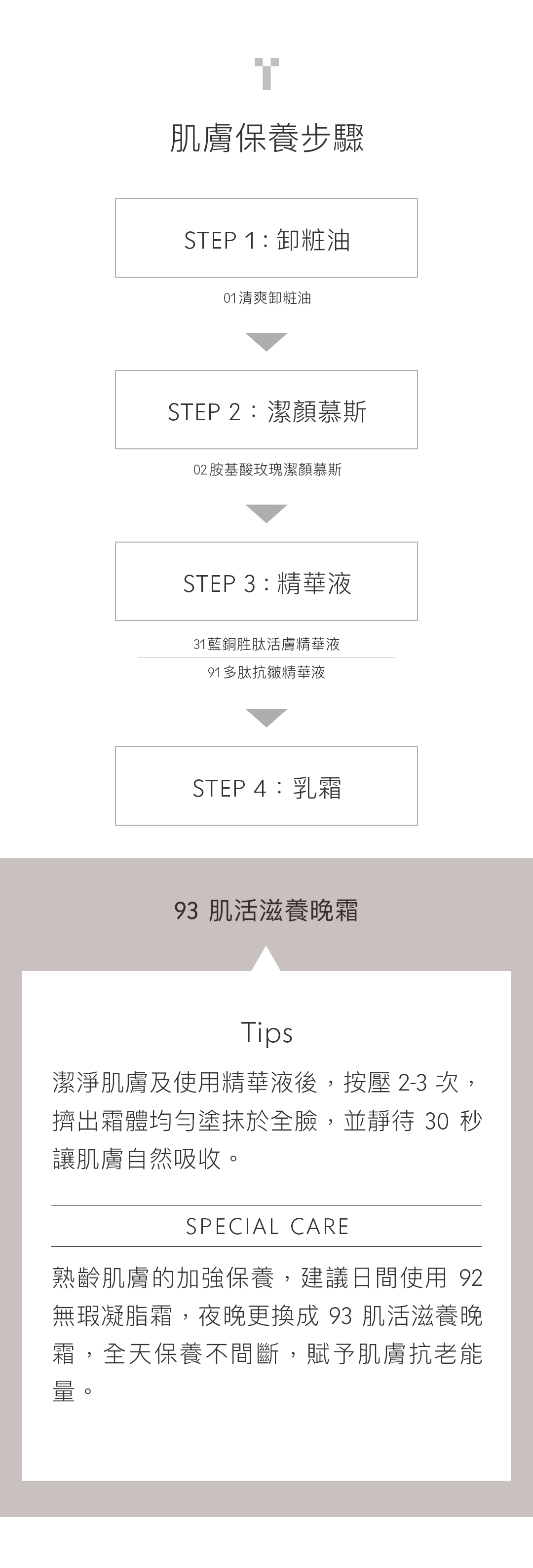含複方胜肽(SYN®-COLL、 SYN®-HYCAN)、維他命A棕櫚酯及維他命B5,有效撫平細紋並使肌膚呈現透亮且細緻的膚況。該霜體深層保濕且滋潤性佳,因而適合中性偏乾及熟齡肌膚使用。